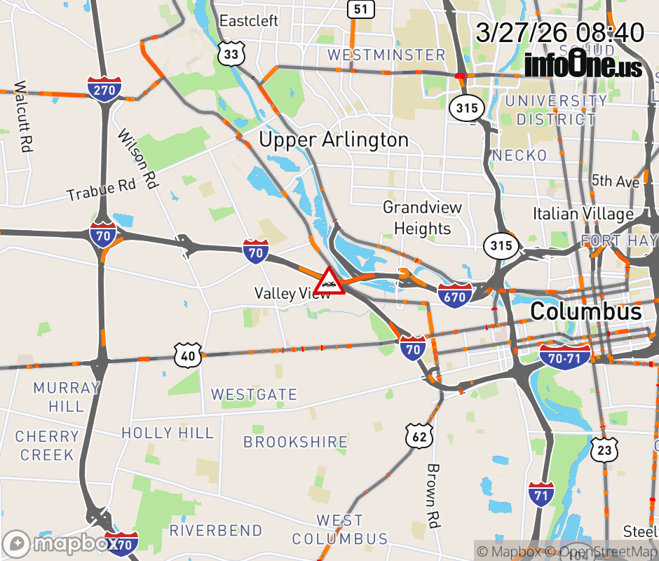 The right lane is blocked on I-670 West beyond US-33, due to a disabled vehicle. ![]() Updated: Fri 3/27/26 8:40 AM EDT |