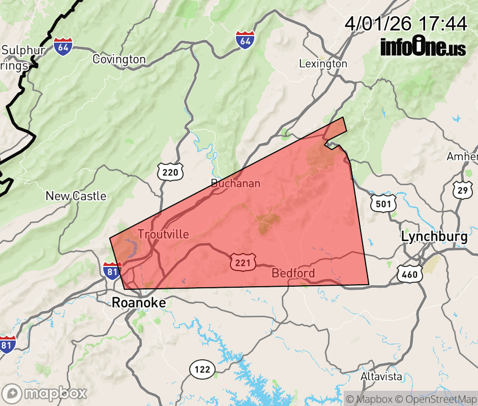 Canceled 4/1/26 6:04 PM Severe Thunderstorm Warning issued April 1 at 5:42PM EDT until April 1 at 6:45PM EDT by NWS Blacksburg VA SVRRNK The National Weather Service in BLACKSBURG has issued a * Severe Thunderstorm Warning for... Northeastern Roanoke County in west central Virginia... South central Rockbridge County in west central Virginia... The northeastern City of Roanoke in west central Virginia... Northern Bedford County in south central Virginia... Southern Botetourt County in west central Virginia... * Until 645 PM EDT. * At 542 PM EDT, a severe thunderstorm was located over Cloverdale, or near Troutville, moving east at 35 mph. HAZARD...60 mph wind gusts and quarter size hail. SOURCE...Radar indicated. IMPACT...Hail damage to vehicles is expected. Expect wind damage to roofs, siding, and trees. * Locations impacted include... Roanoke... Bedford... Buchanan... Glasgow... Troutville... Big Island... and Montvale. ![]() |
