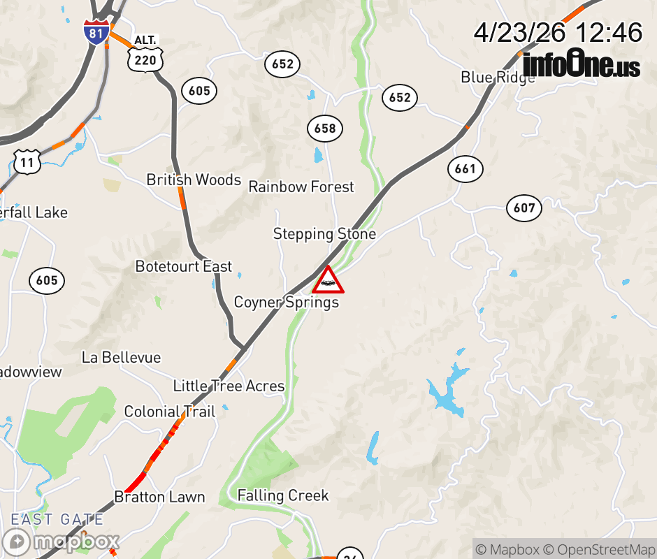 On Rt. 738 in the County of Botetourt, in the vicinity of Davis Rd; Rt. 658N/S (Botetourt County), motorists can expect delays due to a vehicle crash. All north lanes are closed. All south lanes are closed. Updated: Thu 4/23/26 12:46 PM EDT ![]() Updated: Thu 4/23/26 12:46 PM EDT |