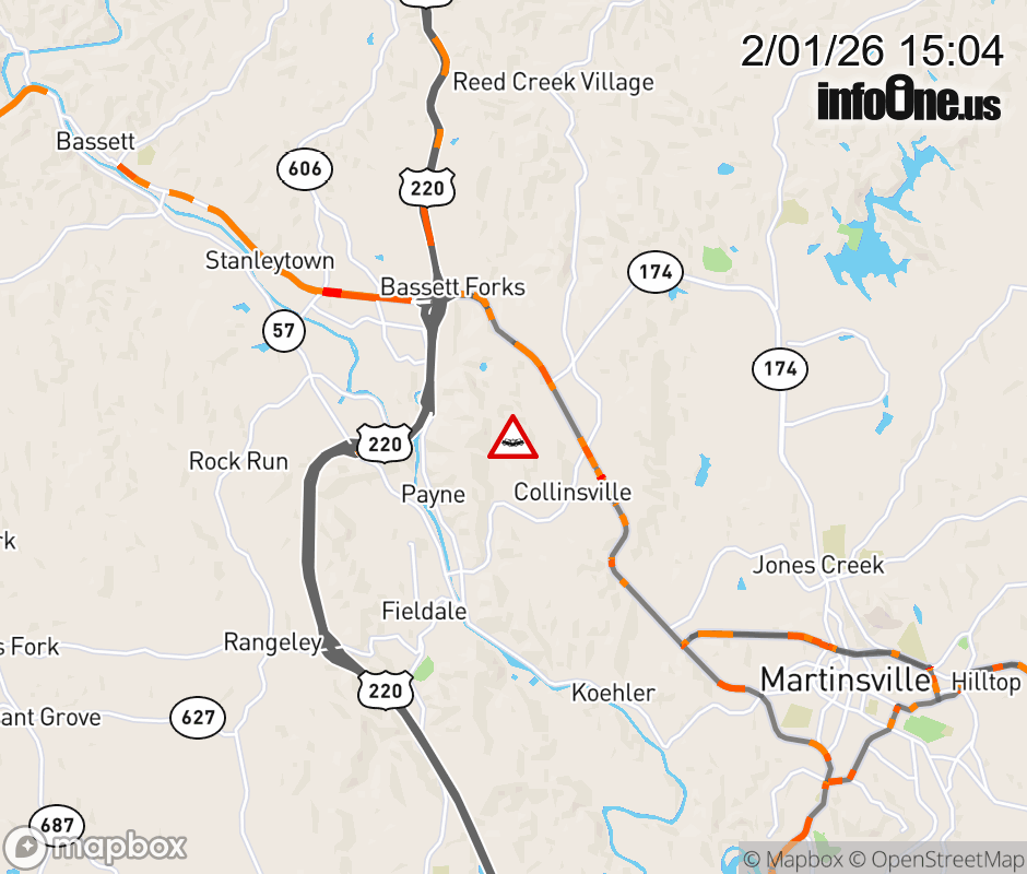 On Rt. 1144 North in the County of Henry, in the vicinity of Autumn Dr; Rt. 1171N/S (Henry County), motorists can expect delays due to a vehicle crash. Lane closures exist. Updated: Sun 2/1/26 3:04 PM EST ![]() Updated: Sun 2/1/26 3:04 PM EST |