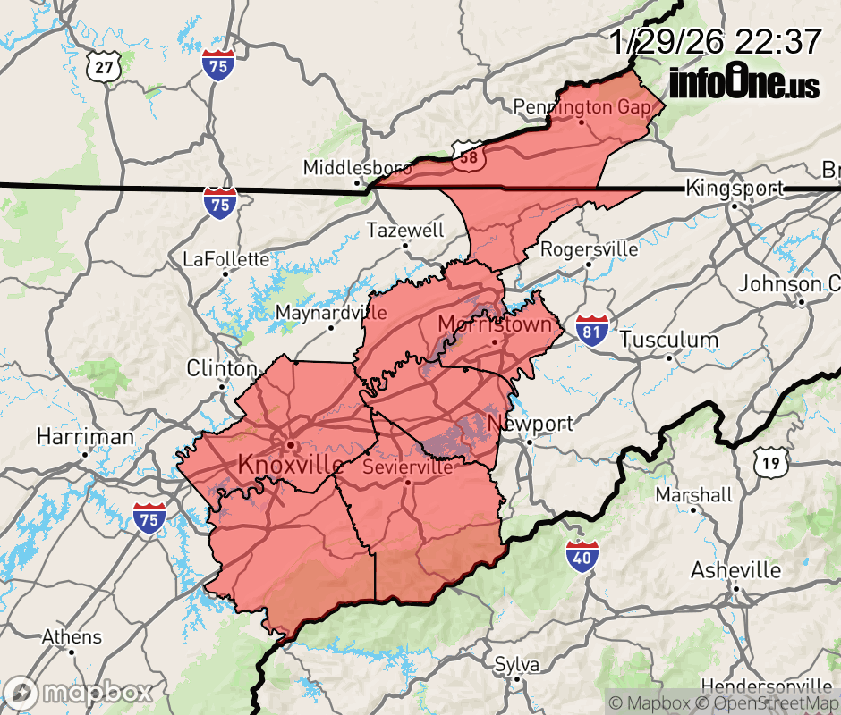 Canceled 1/30/26 12:02 AM Winter Storm Warning issued January 29 at 10:36PM EST until February 1 at 1:00AM EST by NWS Morristown TN * WHAT... Heavy snow expected. Total snow accumulations between 3 and 5 inches. * WHERE... Portions of east Tennessee and southwest Virginia. * WHEN... From 1 PM Friday to 1 AM EST Sunday. * IMPACTS... Travel could be very difficult. The hazardous conditions could impact the Friday evening commute. ![]() |
