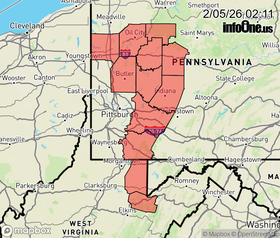 Canceled 2/5/26 11:59 AM Extreme Cold Watch issued February 5 at 2:09AM EST until February 7 at 12:00PM EST by NWS Pittsburgh PA * WHAT... Dangerously cold wind chills as low as 25 below zero possible. * WHERE... Portions of northwest, southwest, and western Pennsylvania and northern West Virginia. * WHEN... From late Friday night through Saturday morning. * IMPACTS... The dangerously cold wind chills as low as 25 below zero could cause frostbite on exposed skin in as little as 30 minutes. ![]() |