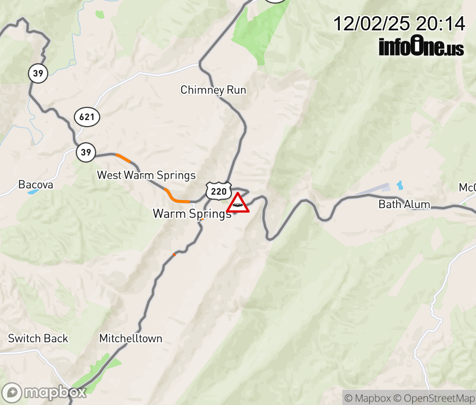 On VA-39 in the County of Bath, in the vicinity of Sam Snead Hwy; US-220N/S, motorists can expect delays due to a vehicle crash. All west lanes are closed. ![]() |