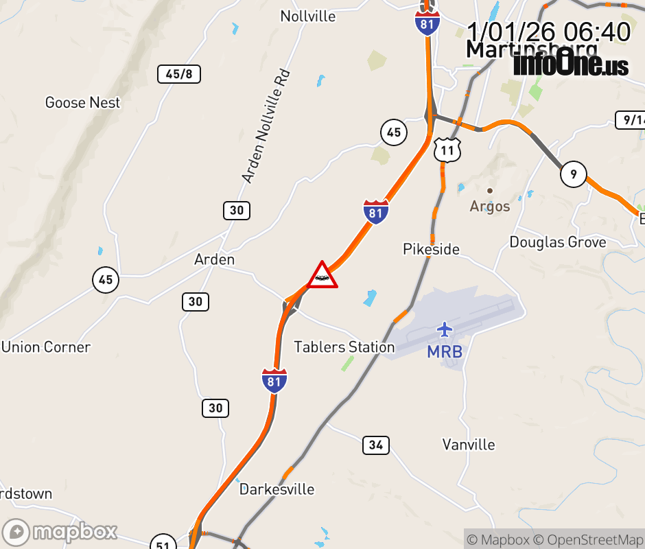 Vehicle Crash on I-81S at Mile Marker 9.0. The southbound right lane is closed. Updated: Thu 1/1/26 6:40 AM EST ![]() Updated: Thu 1/1/26 6:40 AM EST |