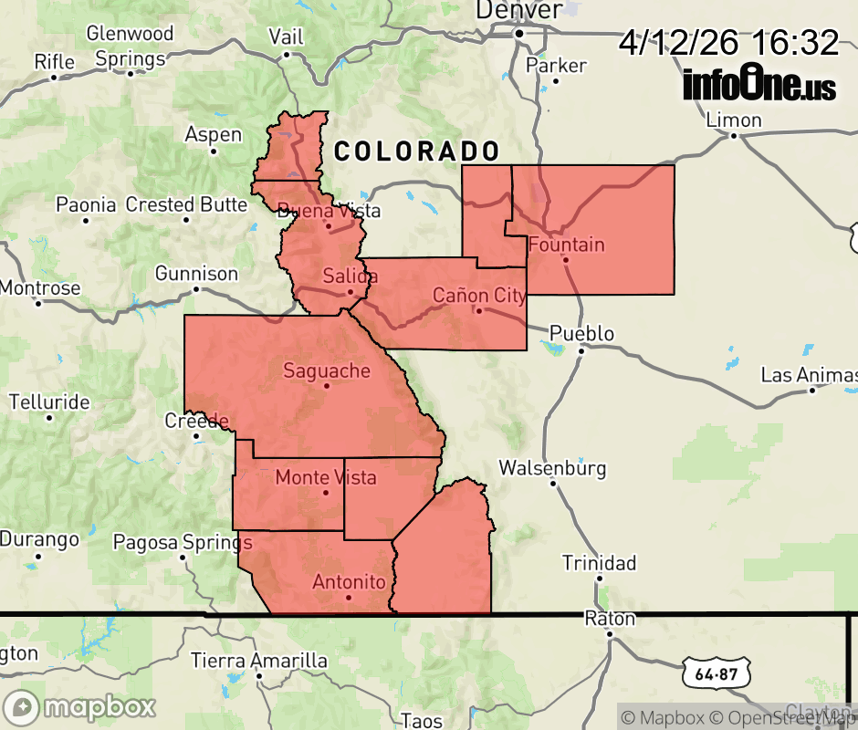 Canceled 4/12/26 9:00 PM Red Flag Warning issued April 12 at 2:30PM MDT until April 12 at 9:00PM MDT by NWS Pueblo CO ...RED FLAG WARNING REMAINS IN EFFECT FROM 11 AM TO 9 PM MDT MONDAY FOR GUSTY WINDS AND LOW RELATIVE HUMIDITY FOR FIRE WEATHER ZONES 220, 221, 222, 224, AND 226... * AFFECTED AREA... Fire Weather Zones 220, 221, 222, 224 and 226. * TIMING... For the first Red Flag Warning, until 9 PM MDT this evening. For the second Red Flag Warning, from 11 AM to 9 PM MDT Monday. * WINDS... Southwest 20 to 30 mph with gusts up to 45 mph. * RELATIVE HUMIDITY... As low as 11 percent. * IMPACTS... Fires will catch and spread quickly. Exercise extreme caution with any outdoor burning. ![]() |
