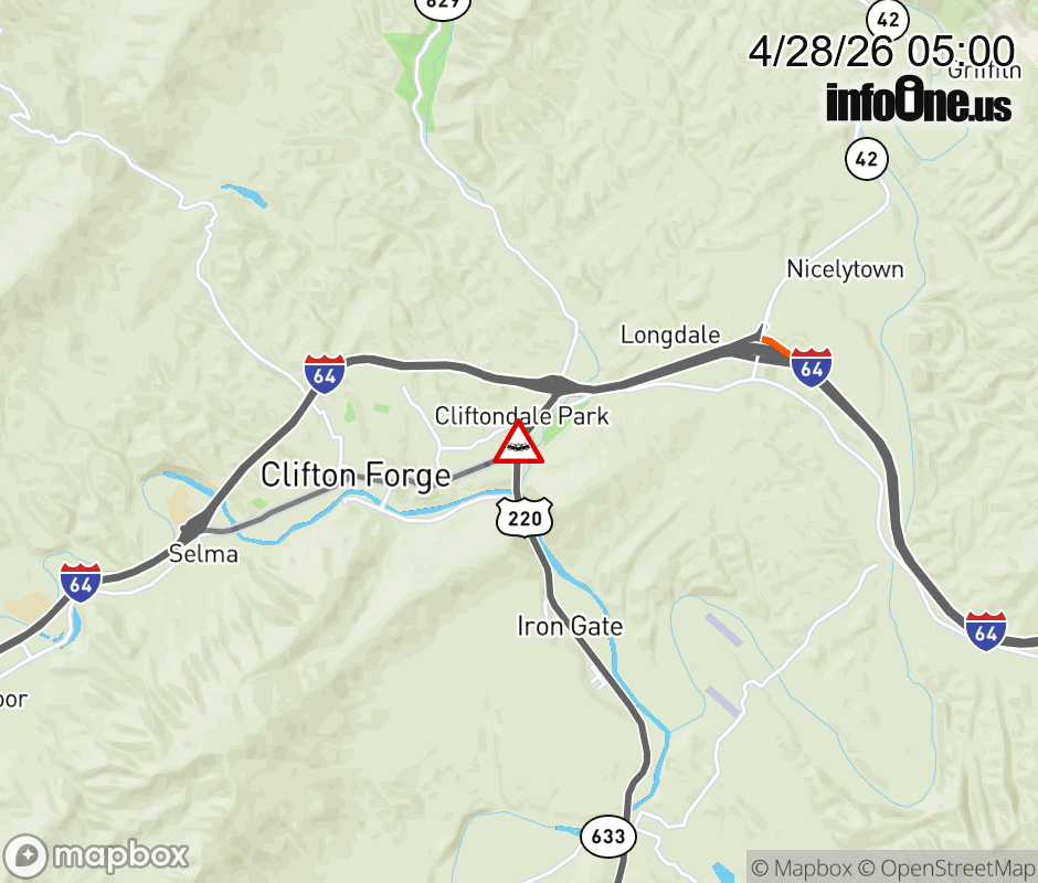 On BUS US-60 in the County of Alleghany, in the vicinity of VA-42N, US-220N; US-220S, VA-42S, motorists can expect delays due to a tractor trailer crash. The west right lane, right shoulder, entrance ramp, and exit ramp are closed. Updated: Tue 4/28/26 5:00 AM EDT ![]() Updated: Tue 4/28/26 5:00 AM EDT |
