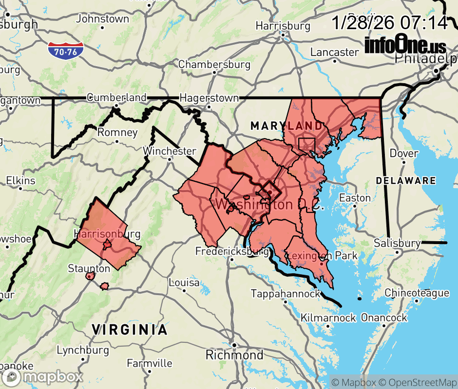 Canceled 1/28/26 10:56 AM Cold Weather Advisory issued January 28 at 7:12AM EST until January 28 at 11:00AM EST by NWS Baltimore MD/Washington DC * WHAT... For the first Cold Weather Advisory, very cold wind chills as low as 8 below zero. For the second Cold Weather Advisory, very cold wind chills as low as 8 below zero expected. * WHERE... Portions of DC, central, northeast, northern, and southern Maryland, and northern and western Virginia. * WHEN... For the first Cold Weather Advisory, until 11 AM EST this morning. For the second Cold Weather Advisory, from 7 PM this evening to 11 AM EST Thursday. * IMPACTS... The cold wind chills as low as 8 below zero could result in hypothermia if precautions are not taken. Frostbite and hypothermia will occur if unprotected skin is exposed to these temperatures. Wind chill values can lead to hypothermia with prolonged exposure. Very cold temperatures can lead to hypothermia with prolonged exposure. * ADDITIONAL DETAILS... Additional Cold Weather Headlines are expected at times through the end of the week as the region remains in an Arctic airmass. ![]() |