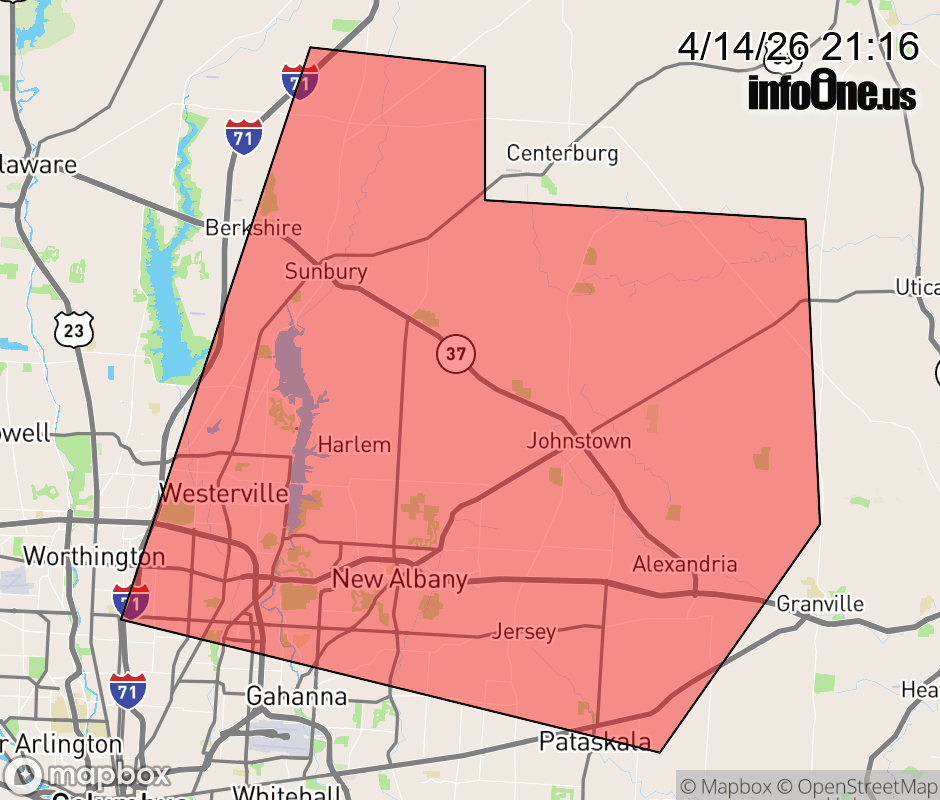 Canceled 4/14/26 9:23 PM Severe Thunderstorm Warning issued April 14 at 9:14PM EDT until April 14 at 9:30PM EDT by NWS Wilmington OH At 913 PM EDT, a severe thunderstorm was located near Center Village, moving southeast at 50 mph. HAZARD...60 mph wind gusts. SOURCE...Radar indicated. IMPACT...Expect damage to trees and power lines. Locations impacted include... Westerville, Gahanna, Pataskala, Johnstown, Sunbury, Minerva Park, Beechwood Trails, Easton, New Albany, Jersey, Galena, Alexandria, Hartford, Olive Green, Huber Ridge, and Center Village. This includes I-71 in Ohio between mile markers 116 and 138. ![]() |