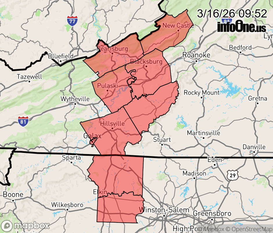 Canceled 3/16/26 11:00 AM Severe Thunderstorm Watch issued March 16 at 9:50AM EDT until March 16 at 11:00AM EDT by NWS Blacksburg VA SEVERE THUNDERSTORM WATCH 64 REMAINS VALID UNTIL 11 AM EDT THIS MORNING FOR THE FOLLOWING AREAS IN NORTH CAROLINA THIS WATCH INCLUDES 2 COUNTIES IN NORTH CENTRAL NORTH CAROLINA SURRY IN NORTHWEST NORTH CAROLINA YADKIN IN VIRGINIA THIS WATCH INCLUDES 8 COUNTIES IN SOUTHWEST VIRGINIA CARROLL CITY OF GALAX CITY OF RADFORD CRAIG FLOYD GILES MONTGOMERY PULASKI ![]() |