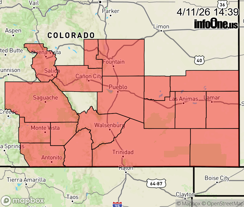 Canceled 4/12/26 2:14 AM Red Flag Warning issued April 11 at 12:37PM MDT until April 12 at 9:00PM MDT by NWS Pueblo CO * AFFECTED AREA... Fire Weather Zones 222, 224, 226, 227, 228, 229, 230, 231, 232, 233, 234, 235, 236 and 237. * TIMING... For the Red Flag Warning, from 11 AM to 9 PM MDT Sunday. For the Fire Weather Watch, from Monday morning through Monday evening. * WINDS... Southwest 20 to 30 mph with gusts up to 45 mph. * RELATIVE HUMIDITY... 5 to 10 percent. * IMPACTS... Elevated fire danger is expected. Fires will catch and spread rapidly and erratically. ![]() |