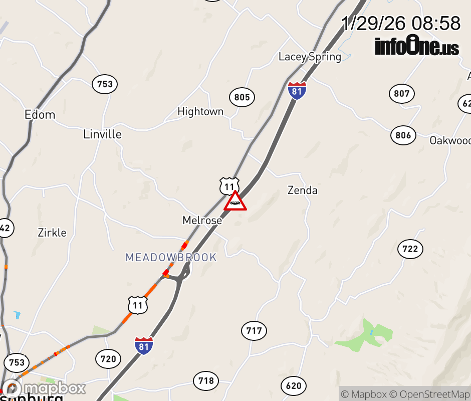 On I-81 at mile marker 253 in the County of Rockingham, motorists can expect delays due to a vehicle crash. The south left shoulder and left lane are closed. ![]() |