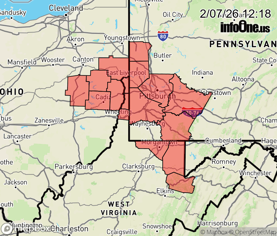 Canceled 2/7/26 9:32 PM Cold Weather Advisory issued February 7 at 12:17PM EST until February 8 at 10:00AM EST by NWS Pittsburgh PA * WHAT... Very cold wind chills as low as 15 below zero. * WHERE... Portions of east central Ohio, southwest and western Pennsylvania, and northern and the northern panhandle of West Virginia. * WHEN... Until 10 AM EST Sunday. * IMPACTS... The cold wind chills as low as 15 below zero could result in hypothermia if precautions are not taken. ![]() |