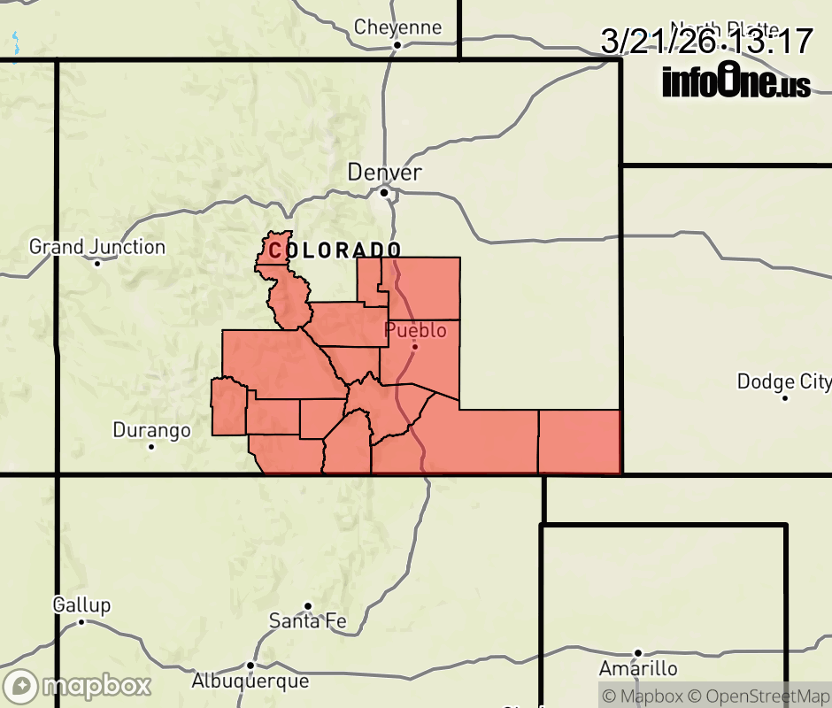 Canceled 3/21/26 11:00 PM Red Flag Warning issued March 21 at 11:16AM MDT until March 21 at 11:00PM MDT by NWS Pueblo CO * AFFECTED AREA... Fire Weather Zones 220, 221, 222, 223, 224, 225, 226, 227, 228, 229, 230 and 237. * TIMING... Until 11 PM MDT this evening. * WINDS... West 20 to 30 mph with gusts up to 45 mph. * RELATIVE HUMIDITY... 4 to 10 percent. * TEMPERATURES... Upper 80s to mid 90s. * IMPACTS... Elevated fire danger is expected. Fires will catch and spread rapidly and erratically. ![]() |