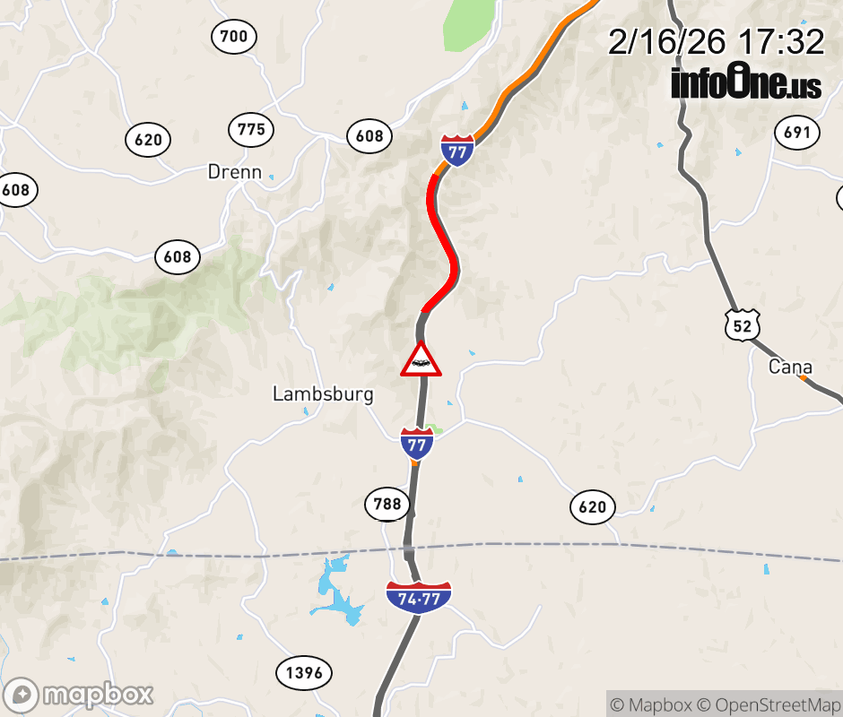 On I-77 at mile marker 2 in the County of Carroll, motorists can expect delays due to a tractor trailer crash. The south left shoulder and left lane are closed. Traffic backups are approximately 3.5 miles. Updated: Mon 2/16/26 5:32 PM EST ![]() Updated: Mon 2/16/26 5:32 PM EST |