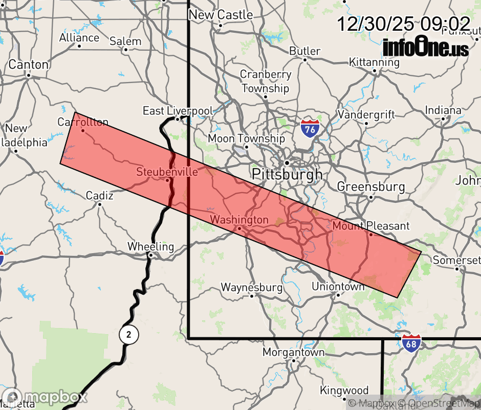 Canceled 12/30/25 9:27 AM Snow Squall Warning issued December 30 at 9:01AM EST until December 30 at 9:45AM EST by NWS Pittsburgh PA The National Weather Service in Pittsburgh has issued a * Snow Squall Warning for... Southeastern Carroll County in east central Ohio... Northeastern Harrison County in east central Ohio... Jefferson OH County in east central Ohio... Southwestern Allegheny County in southwestern Pennsylvania... Northern Fayette County in southwestern Pennsylvania... Central Washington County in southwestern Pennsylvania... Southwestern Westmoreland County in southwestern Pennsylvania... Brooke County in northern West Virginia... Hancock County in northern West Virginia... * Until 945 AM EST. * At 901 AM EST, a dangerous snow squall was located over Bentleyville, or 8 miles south of Gastonville, and was stationary. HAZARD...Intense bursts of heavy snow and gusty winds leading to blowing snow and rapidly falling visibility. SOURCE...Radar indicated. IMPACT...Travel will become difficult and potentially dangerous within minutes. * Locations impacted include... Bethel Park, McMurray, Weirton, Steubenville, Washington, Canonsburg, Connellsville, Carrollton, Wellsburg, Avella, Gastonville, Upper St. Clair, South Park Township, Cecil-Bishop, Jefferson Hills, Monessen, California, Toronto, Donora and Mount Pleasant. This includes the following highways... Interstate 70 in Pennsylvania between mile markers 15 and 52. Interstate 79 in Pennsylvania between mile markers 32 and 52. Pennsylvania Turnpike between mile markers 90 and 91. ![]() |
