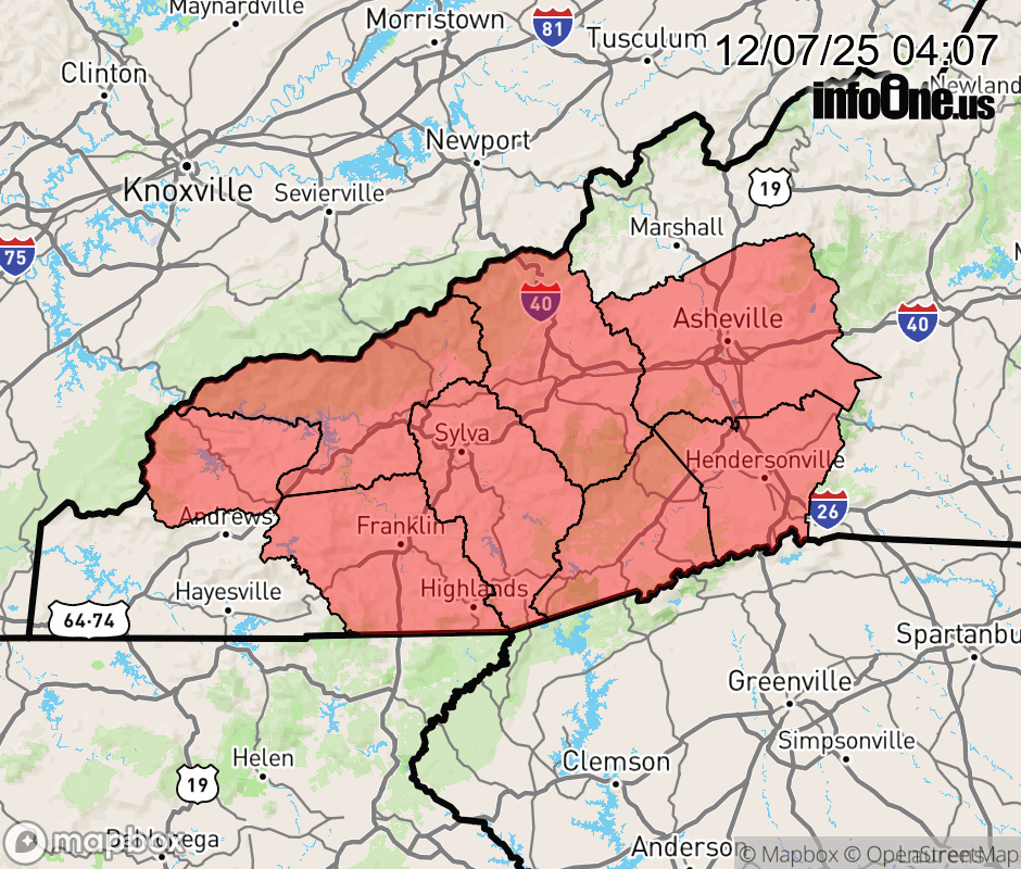 Canceled 12/7/25 4:32 AM Freezing Fog Advisory issued December 7 at 4:05AM EST until December 7 at 10:00AM EST by NWS Greenville-Spartanburg SC * WHAT... Visibility one quarter mile or less in freezing fog. * WHERE... Portions of Buncombe, Graham, Haywood, Henderson, Macon, Northern Jackson, Southern Jackson, Swain, and Transylvania Counties. * WHEN... Until 10 AM EST this morning. * IMPACTS... Hazardous driving conditions due to reduced visibility and icing on bridges and elevated surfaces. ![]() |