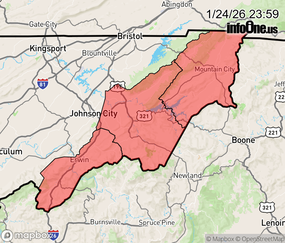 Canceled 1/25/26 11:00 AM Winter Storm Warning issued January 24 at 11:58PM EST until January 25 at 11:00AM EST by NWS Morristown TN * WHAT... Heavy mixed precipitation. Additional snow accumulations up to one inch and ice accumulations between one tenth and one quarter of an inch. Winds gusting as high as 40 mph. * WHERE... Johnson, Northwest Carter, Southeast Carter, and Unicoi Counties. * WHEN... Until 11 AM EST Sunday. * IMPACTS... Power outages and tree damage are likely due to the ice. Travel could be nearly impossible. ![]() |