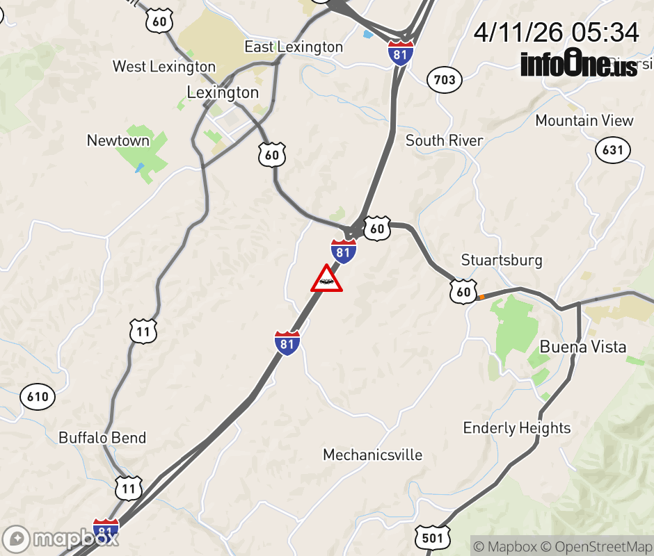 On I-81 at mile marker 188 in the County of Rockbridge, motorists can expect delays due to a vehicle crash. The south left shoulder and left lane are closed. Updated: Sat 4/11/26 5:34 AM EDT ![]() Updated: Sat 4/11/26 5:34 AM EDT |
