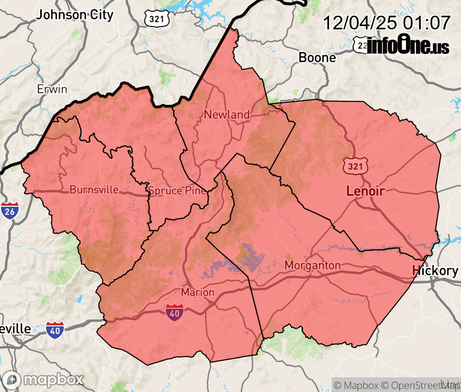 Canceled 12/4/25 12:24 PM Winter Weather Advisory issued December 4 at 1:05AM EST until December 5 at 1:00PM EST by NWS Greenville-Spartanburg SC * WHAT... Mixed precipitation expected. Total snow and sleet accumulations up to three quarters of an inch and ice accumulations around one tenth of an inch. * WHERE... Avery, Mitchell and Yancey Counties, and the mountains of Burke, Caldwell, and McDowell Counties. * WHEN... From 7 PM this evening to 1 PM EST Friday. * IMPACTS... Snow and ice accumulations will make many roads treacherous and impassable. The weight of the snow and ice on tree limbs and power lines could produce isolated outages. The hazardous conditions could impact the Friday morning commute. ![]() |