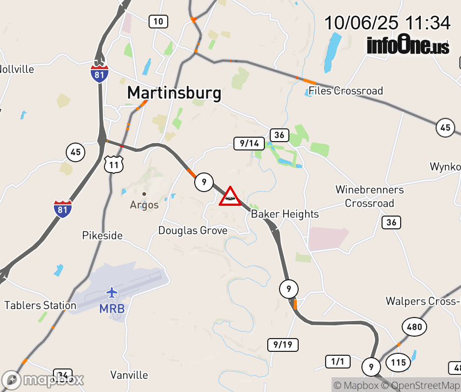In Berkeley County there is a Vehicle Crash on WV-9W at Mile Marker 17.05. 5450 Charlestown Road. ![]() |