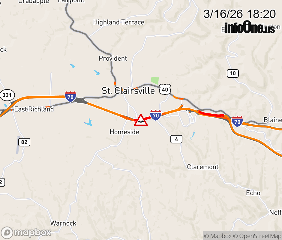 Expect lane closures on I-70 East beyond SR-9/St Clairsville, due to a crash. ![]() |