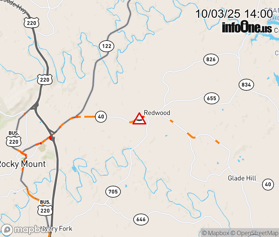 On VA-40 East in the County of Franklin, in the vicinity of Redwood Rd; Rt. 705N/S (Franklin County); / REDWOOD RD, motorists can expect delays due to a vehicle crash. Lane closures exist. ![]() |