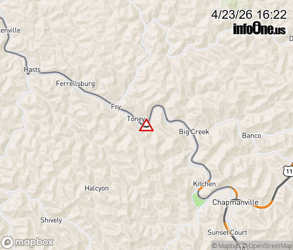 Vehicle Crash on WV-10 (McClellan Highway in Toney Curve). The northbound road is closed. Updated: Thu 4/23/26 4:22 PM EDT ![]() Updated: Thu 4/23/26 4:22 PM EDT |