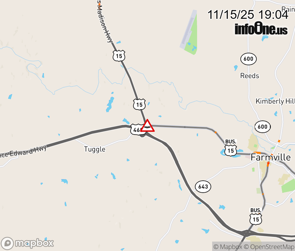 On BUS US-15 North in the County of Prince Edward, in the vicinity of Sheppards Rd; W Third St; US-15N, BUS US-460E (12 Farmville/Prince Edward); US-15N/S; US-15S, BUS US-460W (12 Farmville/Prince Edward), motorists can expect delays due to a vehicle crash. Lane closures exist. ![]() |