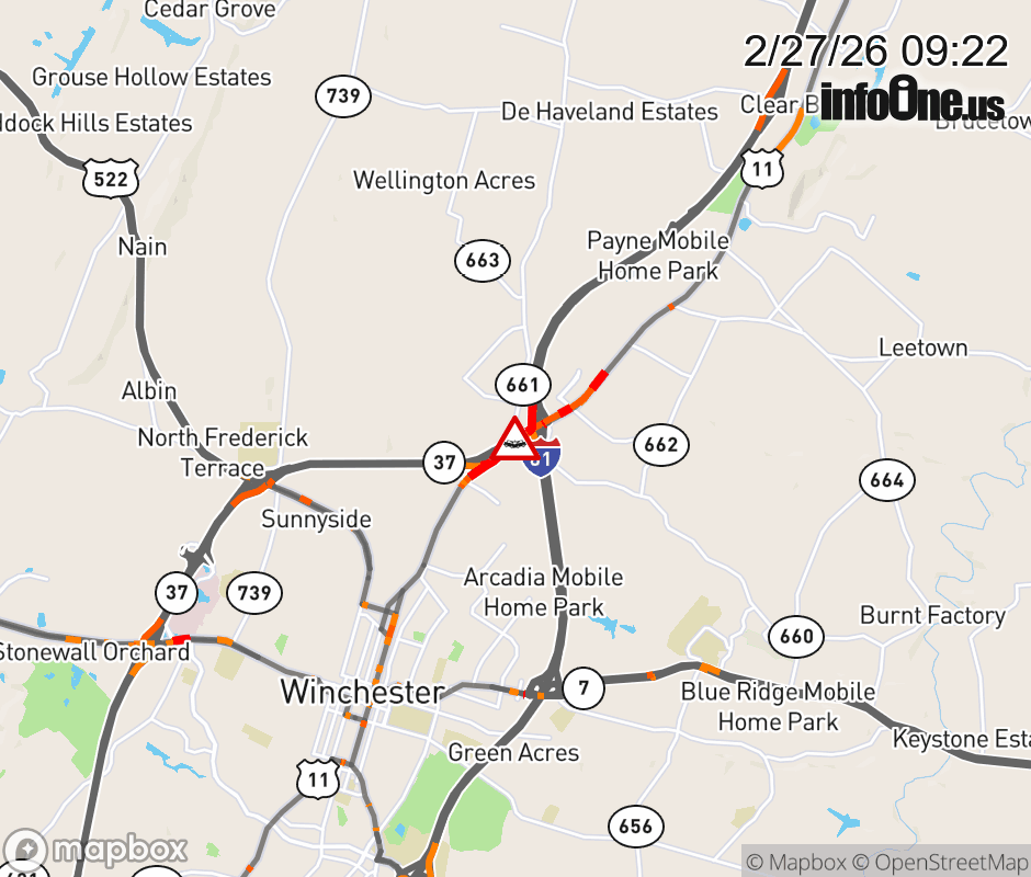 On US-11 in the County of Frederick, in the vicinity of Welltown Rd; Rt. 661N/S (Frederick County), motorists can expect delays due to a tractor trailer crash. The south left shoulder and left lane are closed. Updated: Fri 2/27/26 9:22 AM EST ![]() Updated: Fri 2/27/26 9:22 AM EST |