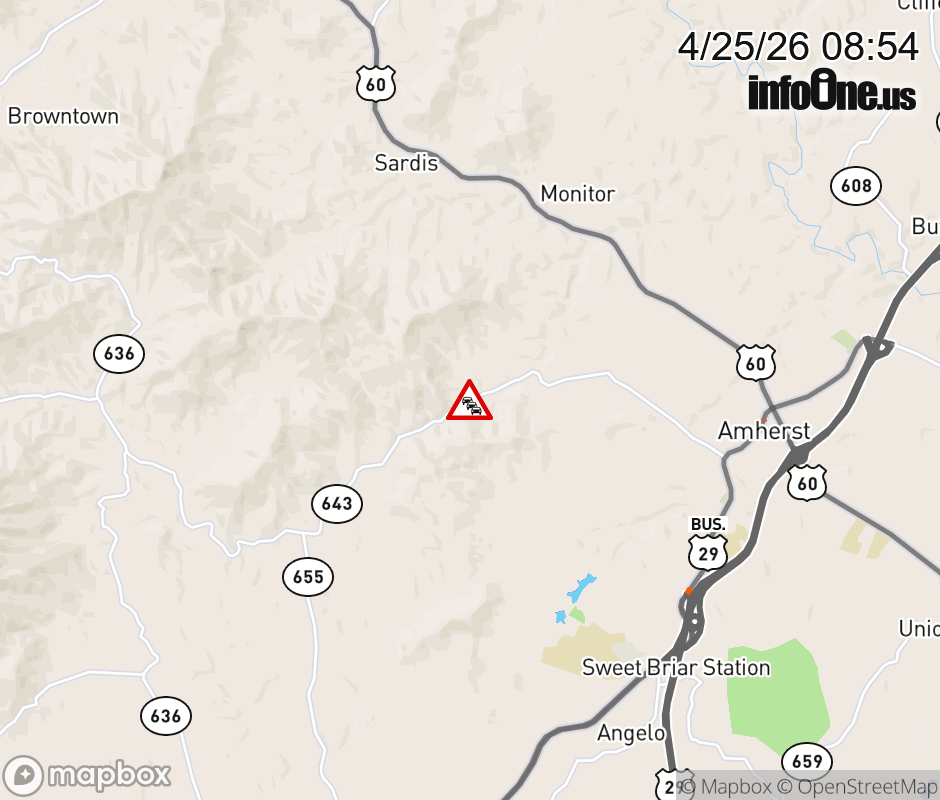 On Rt. 643 in the County of Amherst, in the vicinity of Indian Mission Rd; Rt. 780N/S (Amherst County), motorists can expect delays due to weather. All east lanes are closed. All west lanes are closed. Updated: Sat 4/25/26 8:54 AM EDT ![]() Updated: Sat 4/25/26 8:54 AM EDT |