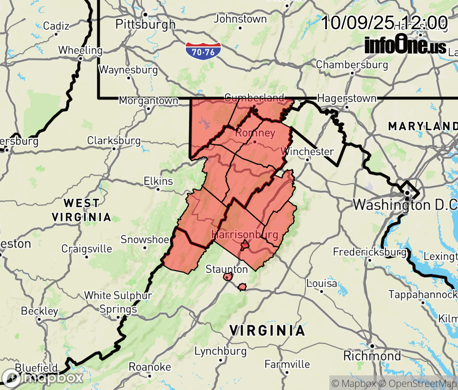 Canceled 10/9/25 5:59 PM Freeze Warning issued October 9 at 11:58AM EDT until October 10 at 9:00AM EDT by NWS Baltimore MD/Washington DC * WHAT... Sub-freezing temperatures as low as the upper 20s expected, especially in the sheltered valleys. * WHERE... Portions of western Maryland, northwest and western Virginia, and eastern West Virginia. * WHEN... From 2 AM to 9 AM EDT Friday. * IMPACTS... Frost and freeze conditions could kill crops, other sensitive vegetation and possibly damage unprotected outdoor plumbing. ![]() |