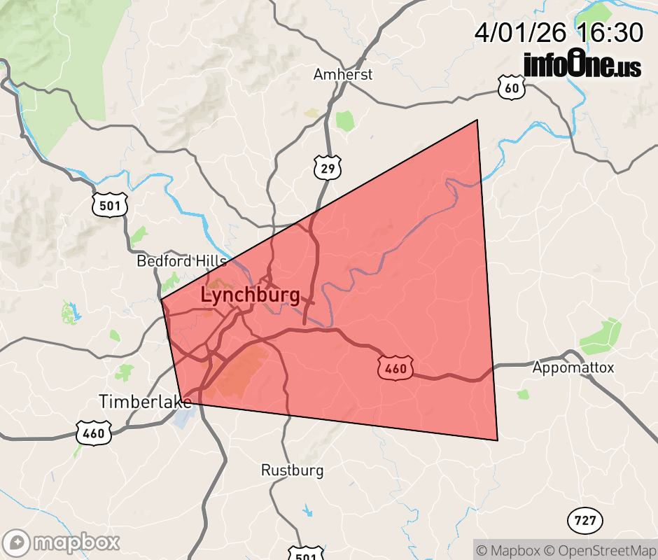 Canceled 4/1/26 5:00 PM Special Weather Statement issued April 1 at 4:29PM EDT by NWS Blacksburg VA At 428 PM EDT, Doppler radar was tracking a strong thunderstorm over Bocock, or near Lynchburg, moving east at 20 mph. HAZARD...Wind gusts up to 50 mph and half inch hail. SOURCE...Radar indicated. IMPACT...Gusty winds could knock down tree limbs and blow around unsecured objects. Minor hail damage to vegetation is possible. Locations impacted include... Lynchburg... Concord... Madison Heights... Stonewall... Bocock... Spout Spring... and Riverville. ![]() |