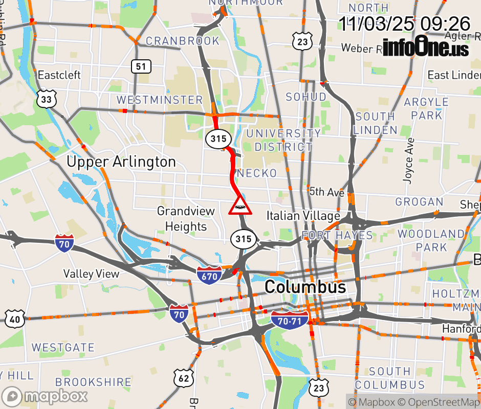The right lane is blocked on SR-315 South at I-670 East, due to a crash. Updated: Mon 11/3/25 9:26 AM EST ![]() Updated: Mon 11/3/25 9:26 AM EST  |