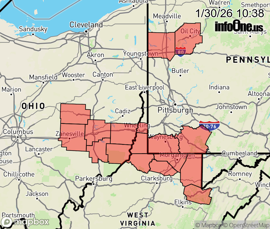 Canceled 1/30/26 12:42 PM Cold Weather Advisory issued January 30 at 10:37AM EST until January 31 at 11:00AM EST by NWS Pittsburgh PA * WHAT... Very cold wind chills as low as 20 below zero expected. * WHERE... Portions of eastern Ohio, northwest and southwest Pennsylvania, and northern West Virginia. * WHEN... From 7 PM this evening to 11 AM EST Saturday. * IMPACTS... The dangerously cold wind chills as low as 20 below zero could result in hypothermia or frostbite if precautions are not taken. ![]() |