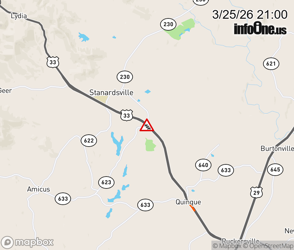On BUS US-33 in the County of Greene, in the vicinity of Stanardsville By-Pass; Swift Run Rd; Rt. 623N/S (Greene County); US-33E, motorists can expect delays due to an incident. All east lanes are closed. All west lanes are closed. Updated: Wed 3/25/26 9:00 PM EDT ![]() Updated: Wed 3/25/26 9:00 PM EDT |