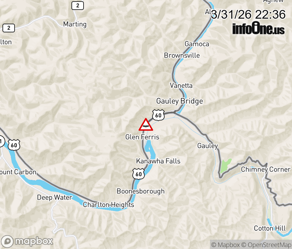Vehicle Crash on US-60 (Midland Trail) & Glen Ferris Loop. Updated: Tue 3/31/26 10:36 PM EDT ![]() Updated: Tue 3/31/26 10:36 PM EDT |