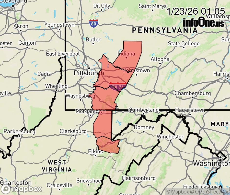 Canceled 1/23/26 2:55 AM Cold Weather Advisory issued January 23 at 1:04AM EST until January 24 at 10:00AM EST by NWS Pittsburgh PA * WHAT... Very cold wind chills between 10 below and 20 below zero expected. * WHERE... In Pennsylvania, Higher Elevations of Fayette, Higher Elevations of Westmoreland, and Higher Elevations of Indiana Counties. In West Virginia, Eastern Preston and Eastern Tucker Counties. * WHEN... From 4 PM this afternoon to 10 AM EST Saturday. * IMPACTS... The dangerously cold wind chills as low as 20 below zero could result in hypothermia or frostbite if precautions are not taken. ![]() |