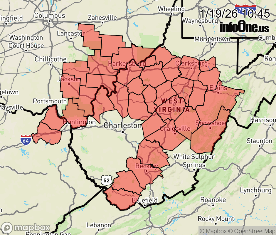 Canceled 1/19/26 6:32 PM Cold Weather Advisory issued January 19 at 10:44AM EST until January 20 at 12:00PM EST by NWS Charleston WV * WHAT... Very cold wind chills as low as 10 below expected. * WHERE... Portions of northeast Kentucky, southeast Ohio, and central, northeast, northern, southeast, southern, and western West Virginia. * WHEN... From 9 PM this evening to noon EST Tuesday. * IMPACTS... The cold wind chills as low as 10 below zero could result in hypothermia if precautions are not taken. Frostbite and hypothermia will occur if unprotected skin is exposed to these temperatures. ![]() |