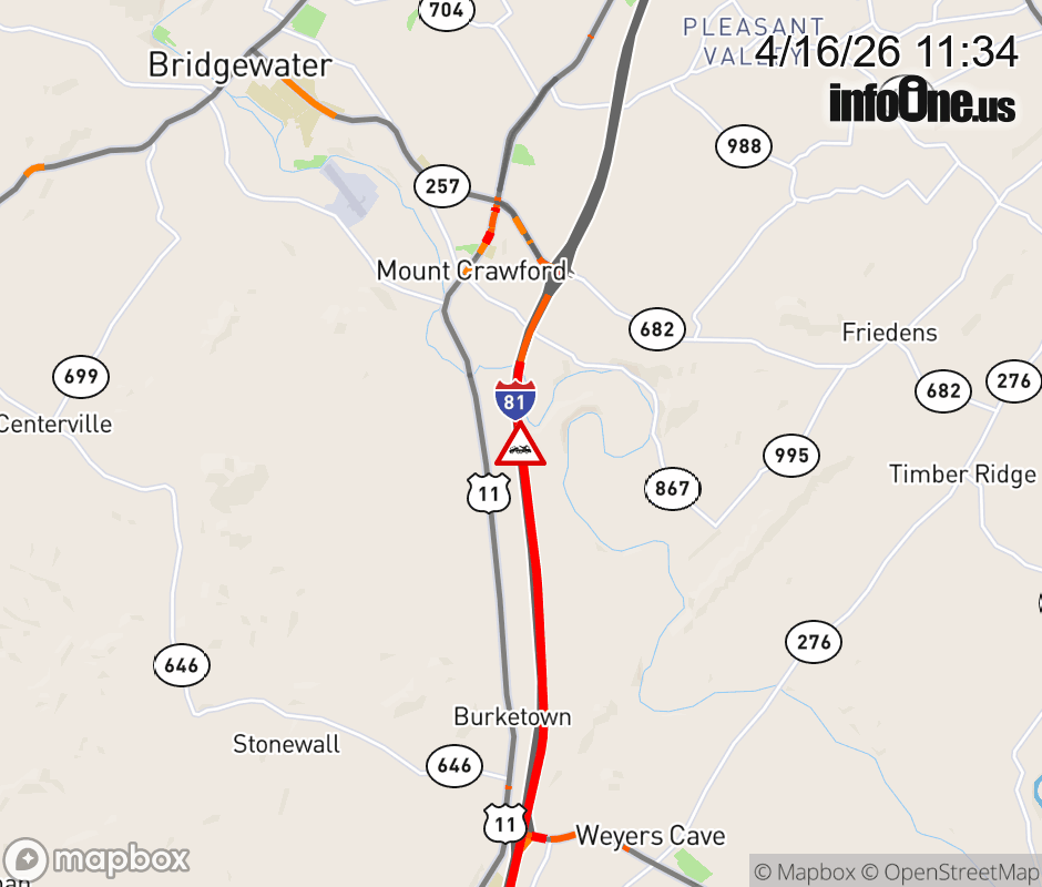 On I-81 North at mile marker 238.5 in the County of Rockingham, motorists can expect delays due to a disabled tractor trailer. Traffic backups are approximately 5.0 miles. Updated: Thu 4/16/26 11:34 AM EDT ![]() Updated: Thu 4/16/26 11:34 AM EDT |