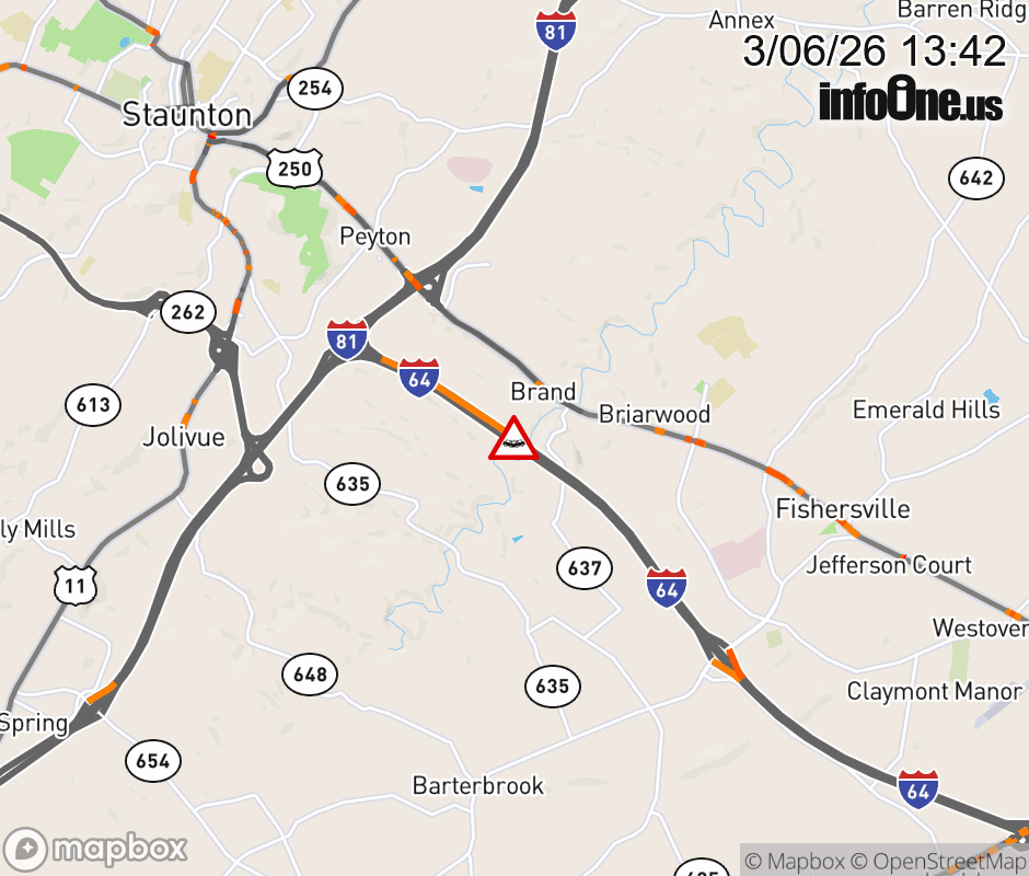 On I-64 at mile marker 89 in the County of Augusta, motorists can expect delays due to a vehicle crash. The west right shoulder is closed. ![]() |