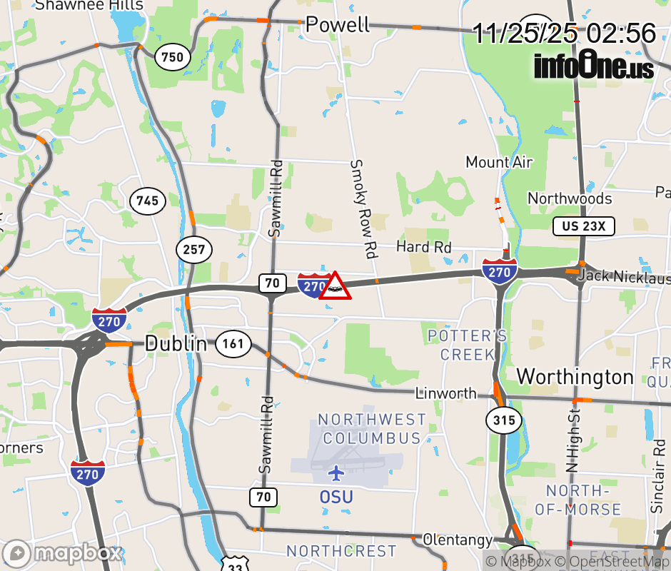 The 2 right lanes are closed on I-270 West beyond SR-315 South, due to a crash. Updated: Tue 11/25/25 2:56 AM EST ![]() Updated: Tue 11/25/25 2:56 AM EST |