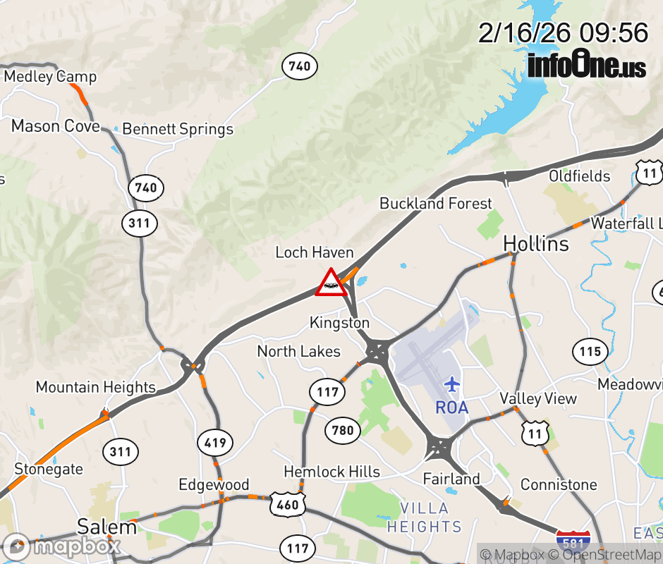 On I-581 at mile marker 6.6 in the County of Roanoke, motorists can expect delays due to a vehicle crash. The north right shoulder is closed. Updated: Mon 2/16/26 9:56 AM EST ![]() Updated: Mon 2/16/26 9:56 AM EST |