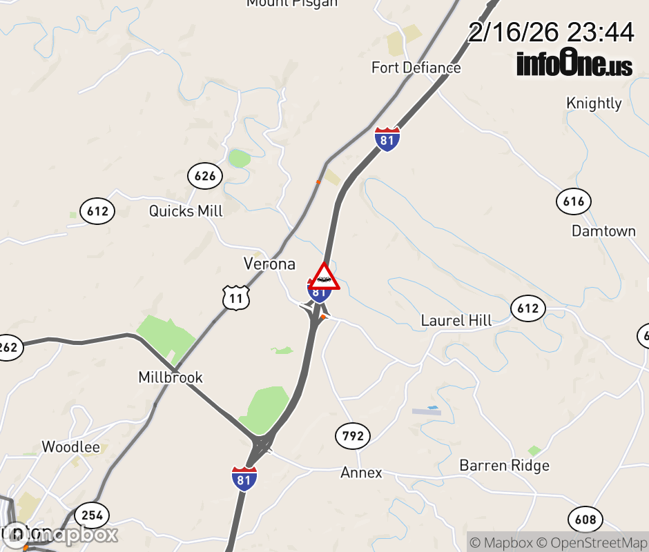 On I-81 at mile marker 228 in the County of Augusta, motorists can expect delays due to a vehicle crash. The north right lane and right shoulder are closed. Updated: Mon 2/16/26 11:44 PM EST ![]() Updated: Mon 2/16/26 11:44 PM EST |