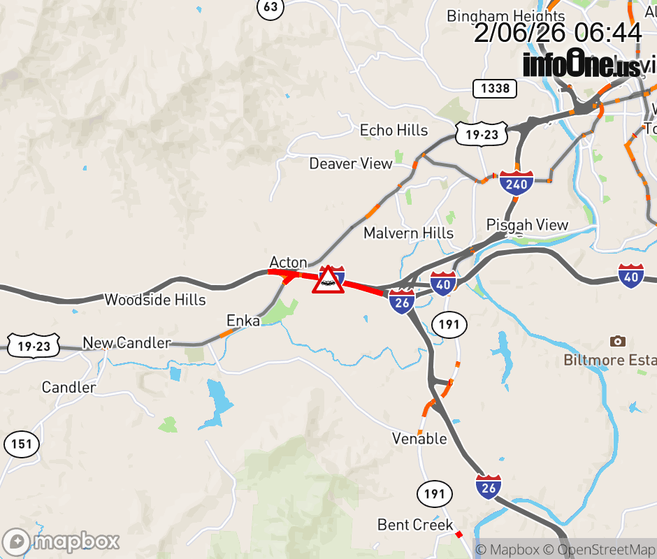 The right lane is closed after Exit 44, US 74 Alt (Smokey Park Highway). Updated: Fri 2/6/26 6:44 AM EST ![]() Updated: Fri 2/6/26 6:44 AM EST |