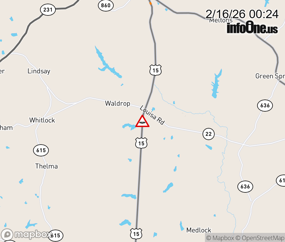 On US-15 North in the County of Louisa, in the vicinity of Louisa Rd; VA-22E, motorists can expect delays due to a tractor trailer crash. ![]() |