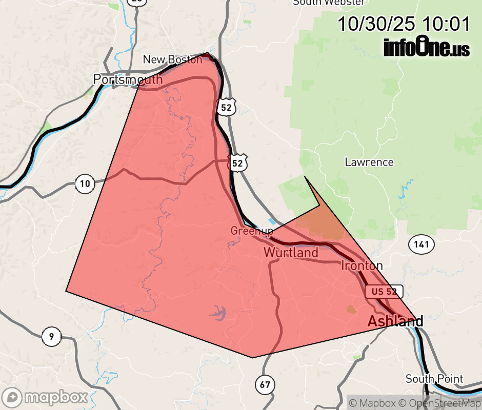 Canceled 10/30/25 1:00 PM Special Weather Statement issued October 30 at 9:59AM EDT by NWS Charleston WV Locations impacted include... Ashland, Portsmouth, Ironton, Coal Grove, Greenup, Load, Greenbo Lake, Letitia, Flatwoods, Russell, Raceland, Worthington, South Shore, Wurtland, Bellefonte, Westwood, Hanging Rock, Sciotoville, Warnock, and Grays Branch. Heavy rain may cause ponding of water on roadways and flooding in low-lying and poor drainage areas. ![]() |