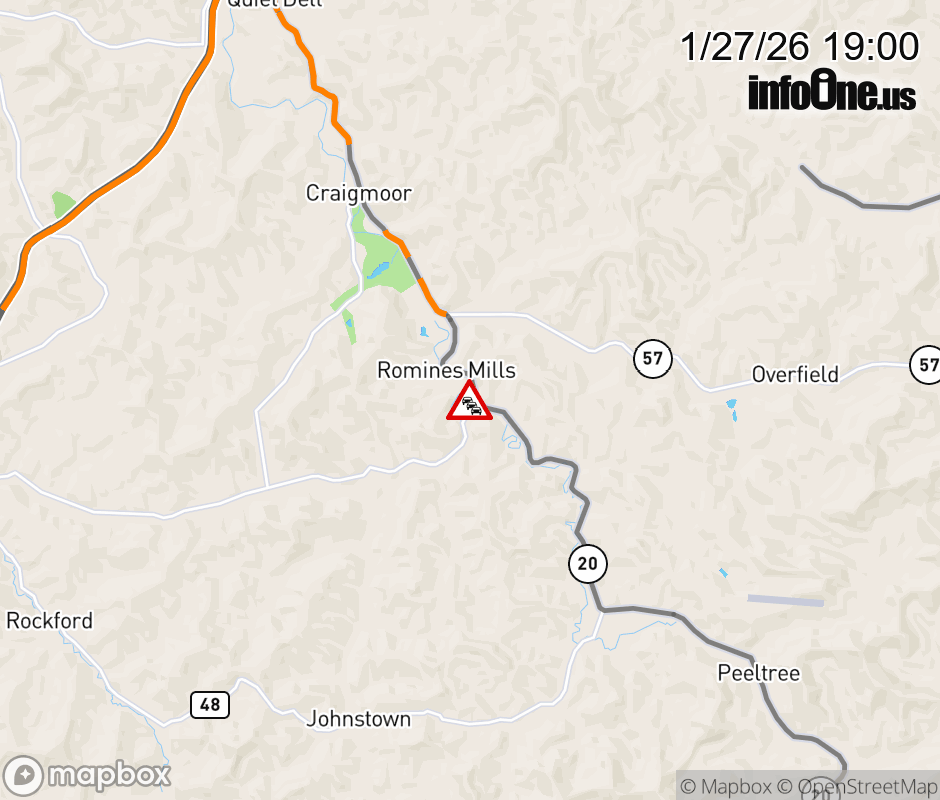Road Closure on WV-20 at Mile Marker 3.5. Updated: Tue 1/27/26 7:00 PM EST ![]() Updated: Tue 1/27/26 7:00 PM EST |