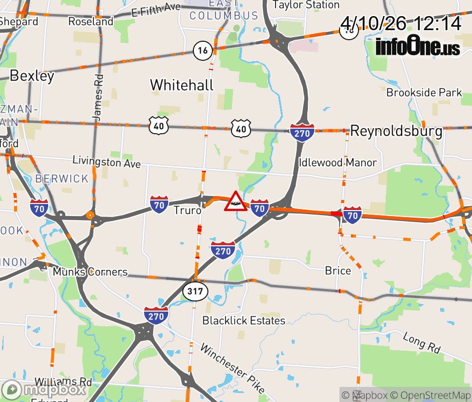 The left shoulder is blocked on I-70 West beyond I-70 West C-D Road, due to a crash. Updated: Fri 4/10/26 12:14 PM EDT ![]() Updated: Fri 4/10/26 12:14 PM EDT |