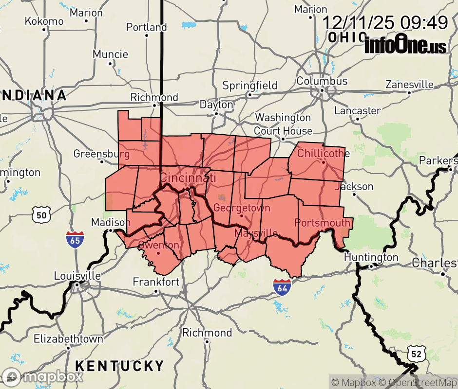 Canceled 12/11/25 2:12 PM Winter Weather Advisory issued December 11 at 9:47AM EST until December 12 at 10:00AM EST by NWS Wilmington OH * WHAT... Snow expected. Total snow accumulations between 2 and 4 inches. * WHERE... Portions of east central and southeast Indiana, northeast and northern Kentucky, and south central and southwest Ohio. * WHEN... From 7 PM this evening to 10 AM EST Friday. * IMPACTS... Plan on slippery road conditions. The hazardous conditions could impact the Thursday evening and Friday morning commutes. ![]() |