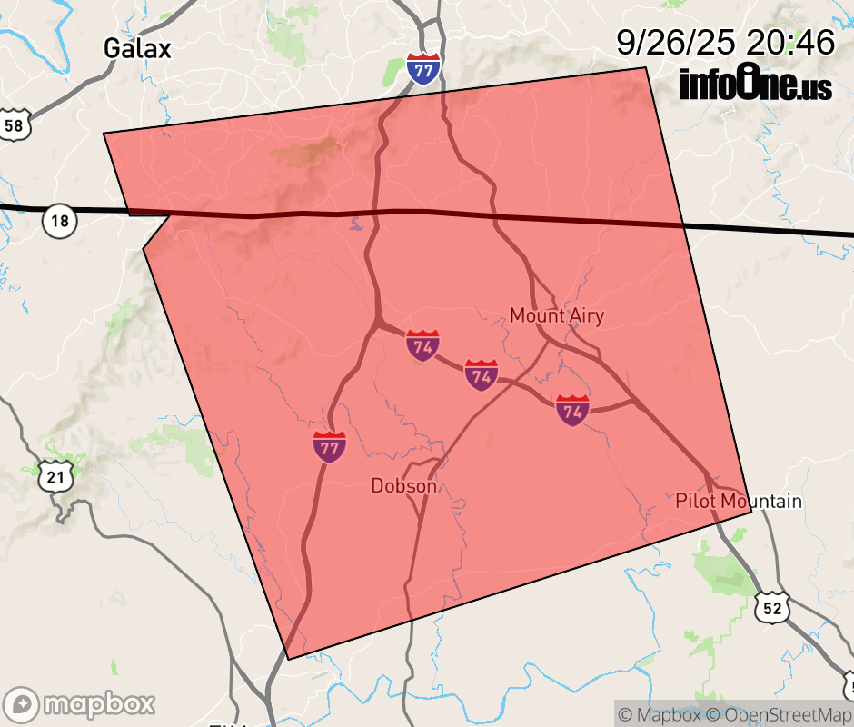 Canceled 9/26/25 9:15 PM Special Weather Statement issued September 26 at 8:45PM EDT by NWS Blacksburg VA At 844 PM EDT, Doppler radar was tracking a cluster of strong thunderstorms near Dobson, moving northeast at 20 mph. HAZARD...Pea size hail and wind gusts up to 30 mph. SOURCE...Radar indicated. IMPACT...Loose objects may be knocked over due to wind gusts. Locations impacted include... Mount Airy... Fairview... Flat Rock... Dobson... Pilot Mountain... Cana... and Mountain Park. ![]() |